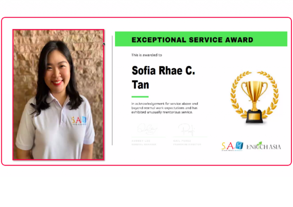 Teacher Sofia joined S.A.M San Mateo in January 2018 during its pre-opening phase. Since then, Teacher Sofia has demonstrated unusually meritorious performance and exceptional service to the Center and its customers and to the S.A.M brand as a whole. If there ever is a “perfect” employee, Teacher Sofia would be it. In her more than two years as a Certified S.A.M Trainer, she has never reported late for work. She comes to the Center 30 to 45 minutes before the classes start. She comes prepared for the lessons for the day, taking the time to review the topics and the appropriate anchor activities for each student. She is not content with the given CPA activities in the worksheets, but continues to research and come up with other activities. This is one of the reasons why she keeps her students engaged and motivated to learn. Her students could also feel Teacher Sofia’s genuine love and concern for each one of them, and they reciprocate this love to Teacher Sofia. These are examples of feedback and praises we received from the students and the parents: In Teacher Sofia’s almost three years stay with S.A.M San Mateo, the Center has never received any complaint/negative feedback against her. This is testament to Teacher Sofia’s consistent outstanding performance and service. Teacher Sofia also exhibits excellent leadership competencies. The Center Owner had frequently been out of town or out of the country in 2019, but Teacher Sofia stepped up and took charge of the Center. The Center’s operations went smoothly even in the absence of the owner, thanks to Teacher Sofia’s management skills and genuine concern for the Center. Her promotion to Assistant Center Manager/S.A.M Certified Trainer was definitely well-deserved. At present, she continues to co-manage the Center effectively. When the health crisis hit the country and the Center had to immediately transition to online learning, Teacher Sofia’s creativity and innovative spirit helped the Center cope. She initiated systems and procedures to help the Center Owner and the other teachers in the transition. These include the use of google sheets to track and monitor attendance and progress of students and training her co-teachers in the use of Zoom. To this day, she continues to selflessly share her ideas in making the online classes fun and engaging. She is always eager to share her work, thoughts and ideas not just to the Center but to the whole S.A.M organization. Teacher Sofia’s dedication is beyond question. In April, the area where she resides lost power for several days. So as not to miss her classes, she went to her uncle’s house to conduct the online classes there, but still taking the necessary health protocols. A few days ago, she suffered a fracture in her left foot. A few hours after the accident and still in too much pain, she was conducting her online classes. Her love for the students and S.A.M propel her to continue delivering excellent service. Teacher Sofia is one of S.A.M’s most valuable team member and her desire to grow and contribute to the organization’s success has to be recognized. |